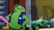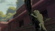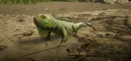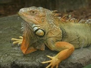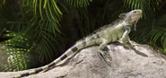 The green iguana has long been hunted for food by South Americans, who call it 'bamboo chicken', although some say the taste resembles rabbit. Many wild iguanas have been captured for the pet industry but iguana farms now cater for the trade and laws protect it from over-hunting.
