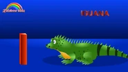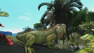 High up in the branches of mangrove trees, well camouflaged by leaves, the green iguana (Iguana iguana) feels fairly well protected and browses on leaves, flowers and fruit. If it is threatened, this large lizard will dive from the tree into a swamp or river and swim to safety. It can fall 12-15 metres to the ground unhurt if the water is too far away to break its fall. Not all of its time is spent climbing or swimming: the cold-blooded iguana also lies on rocks basking in the sunshine.